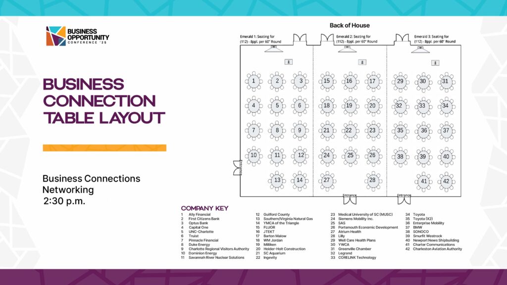 • Curated Roundtable Interactions: Each table features a corporate host and 6–7 rotating MBE participants. You’ll have 20 minutes per session to engage directly with decision-makers from corporations aligned to your industry—finance, healthcare, energy, and more.