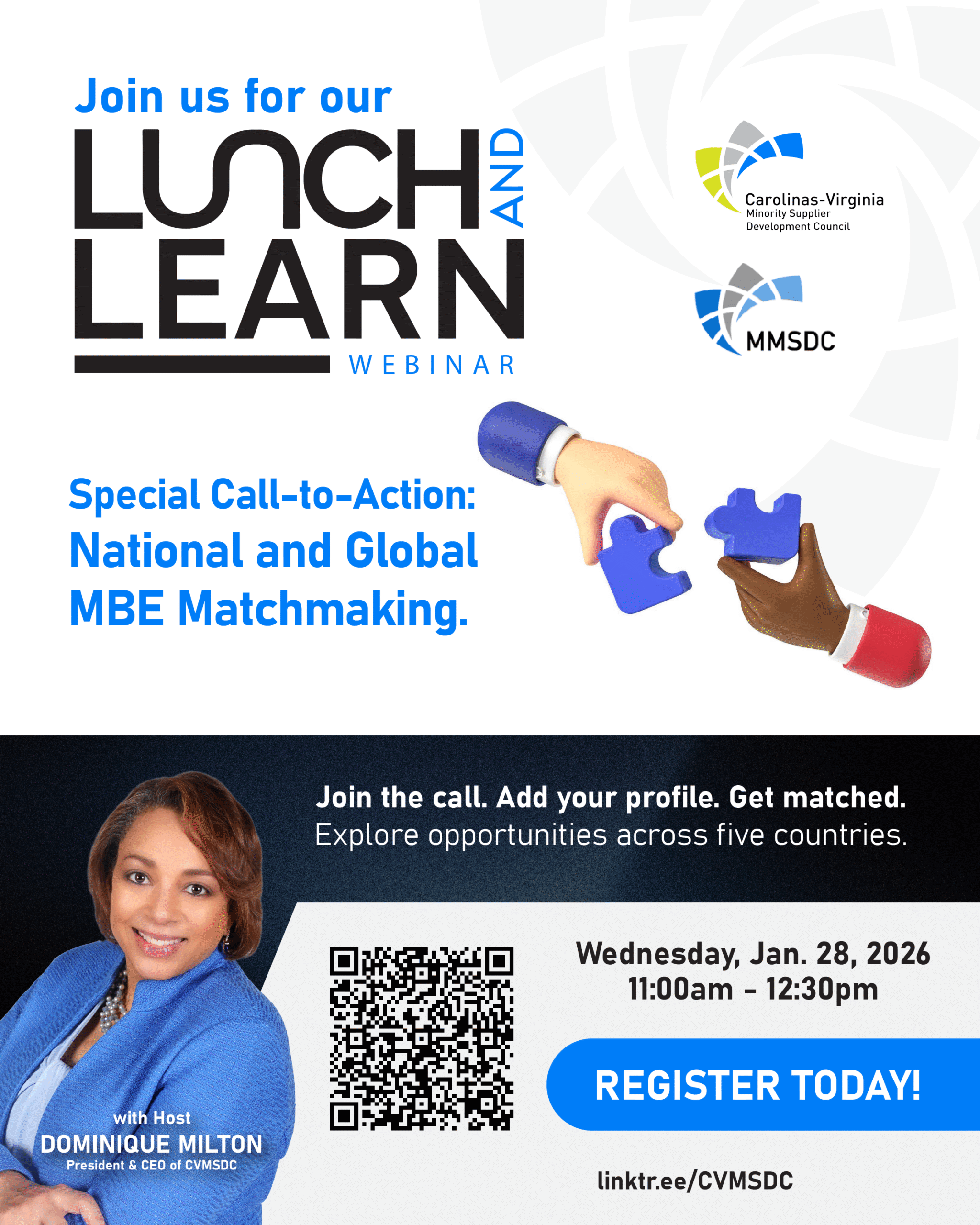 Join us on January 28th for our next Lunch and Learn Webinar with MMSDC (Michigan Minority Supplier Development Council)! This webinar is a special call-to-action for national and global MBE Matchmaking Join the call. Add your profile. Get Matched. Explore opportunities across five countries. If this sounds like you, register today! When: January 28th.2026 from...